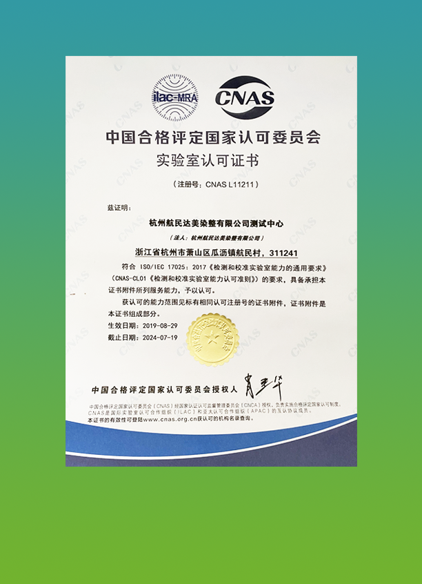 杭州航民達(dá)美染整有限公司測試中心是獲中國合格評定國家認(rèn)可委員會(CNAS)認(rèn)可的實驗室,認(rèn)可的檢測能力范圍包括起毛起球、拉伸、撕破等9大類26項。